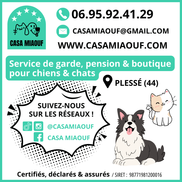 Casa Miaouf c'est une pension et garderie canine (et féline) située dans un cadre arboré à Plessé en Loire-Atlantique, proposant des installations tout confort et sécurisées. Des nouvelles quotidiennes via des photos et vidéos.